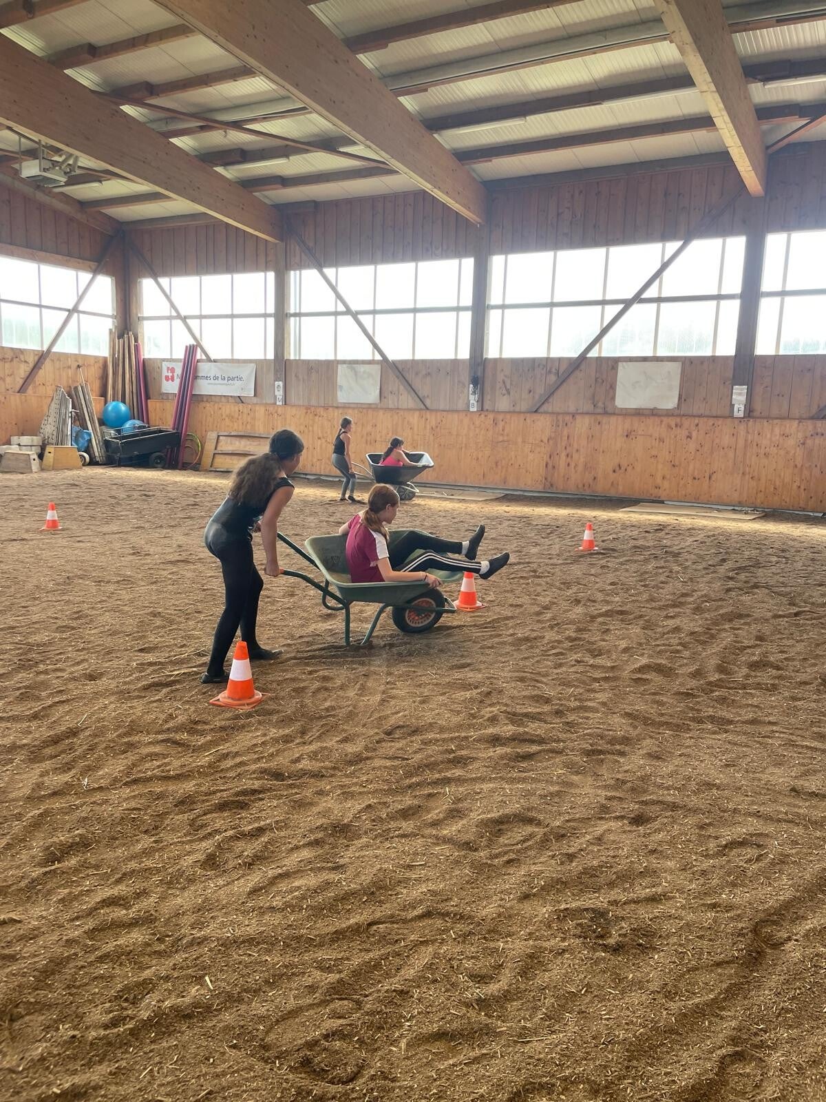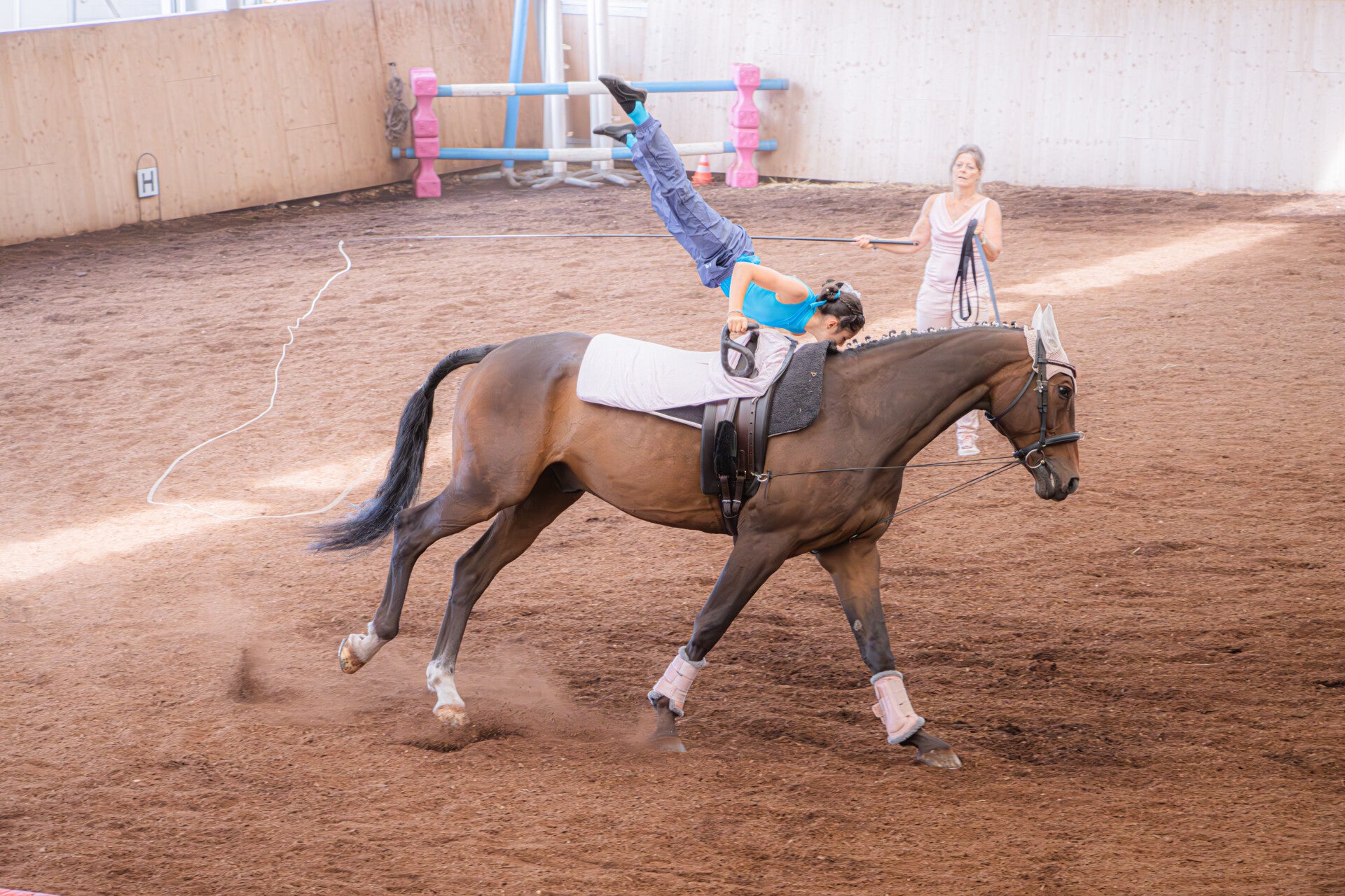 La voltige se pratique dans un manège couvert, sur un sol souple, avec des chevaux ou poneys calmes et expérimentés.